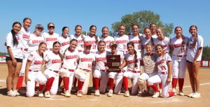 The Lone Grove softball team celebrates its Class 4A Super Regional championship on Thursday after cruising to 10-0 and 12-0 wins over Glenpool. (Beau Bearden/The Ardmoreite)